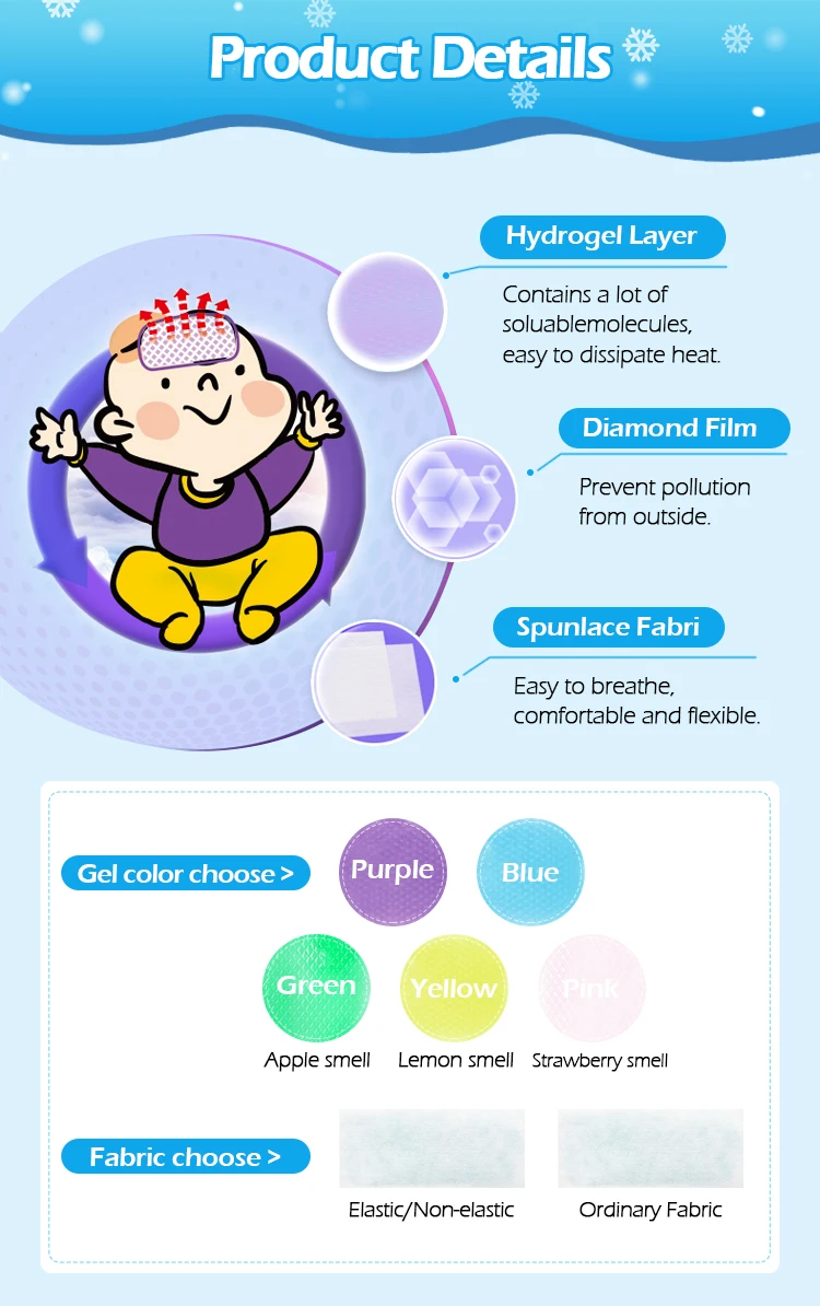 Production Description:Colors ice cooling gel patch for fever hydrogel fever cooling patch with cheap price